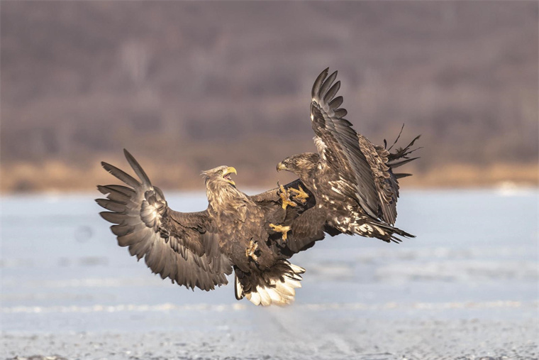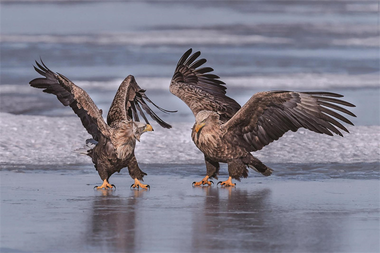 初春时节,珲春敬信湿地依然春寒料峭,虎头海雕、白尾海雕等猛禽的到来为冰封的龙山湖增添了生机。它们在冰面踱步、起舞、争斗,吸引各地摄影爱好者和游客捕捉精彩瞬间。